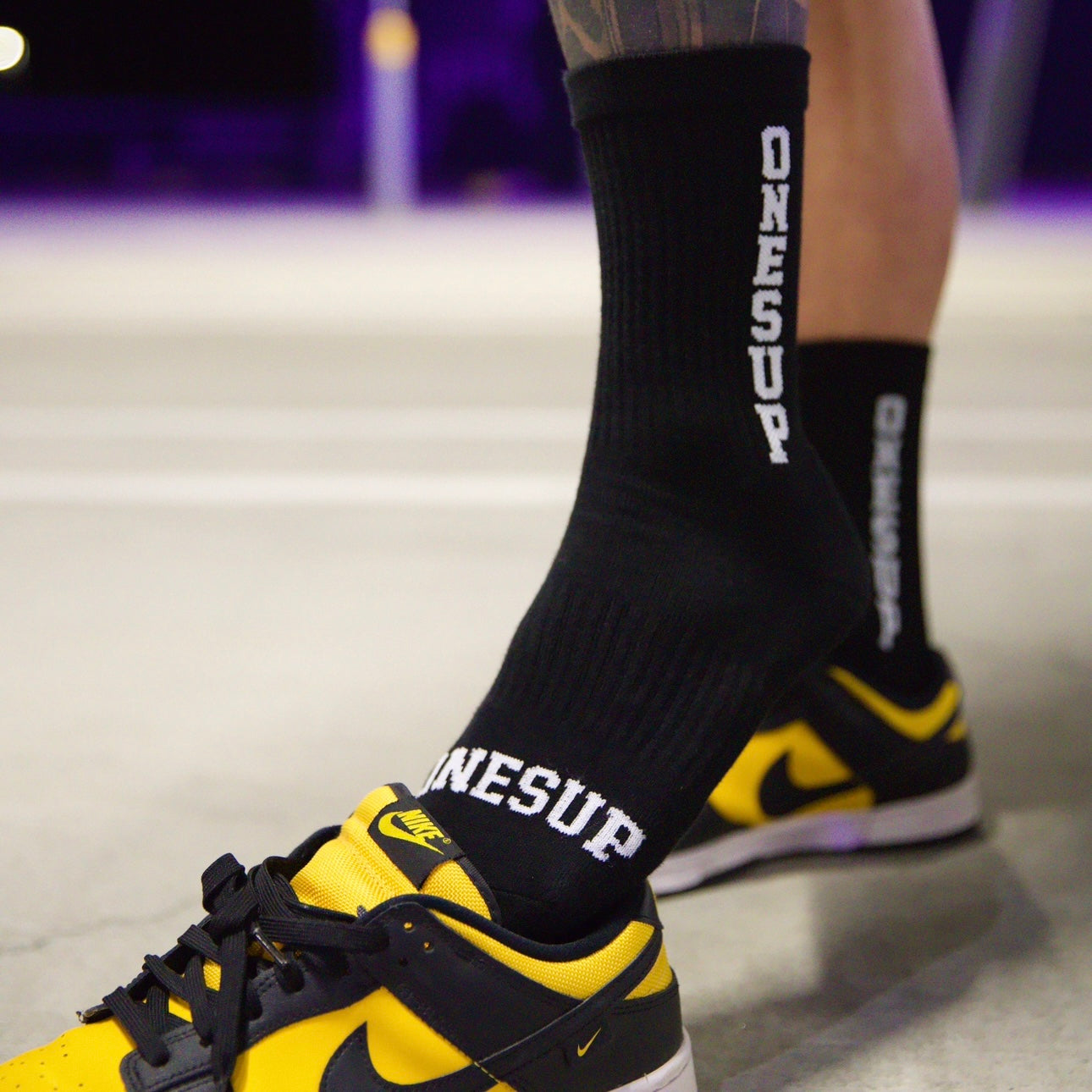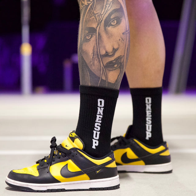 ONESUP Mid-Length Socks just landed — blacked out with bold vertical branding and an arched hit across the toes.