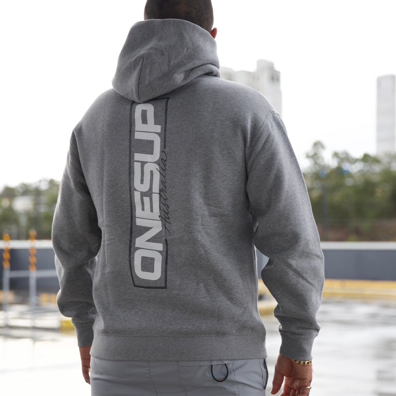 This grey hoodie features ONESUP across the chest and ONESUP AUSTRALIA running down the back.